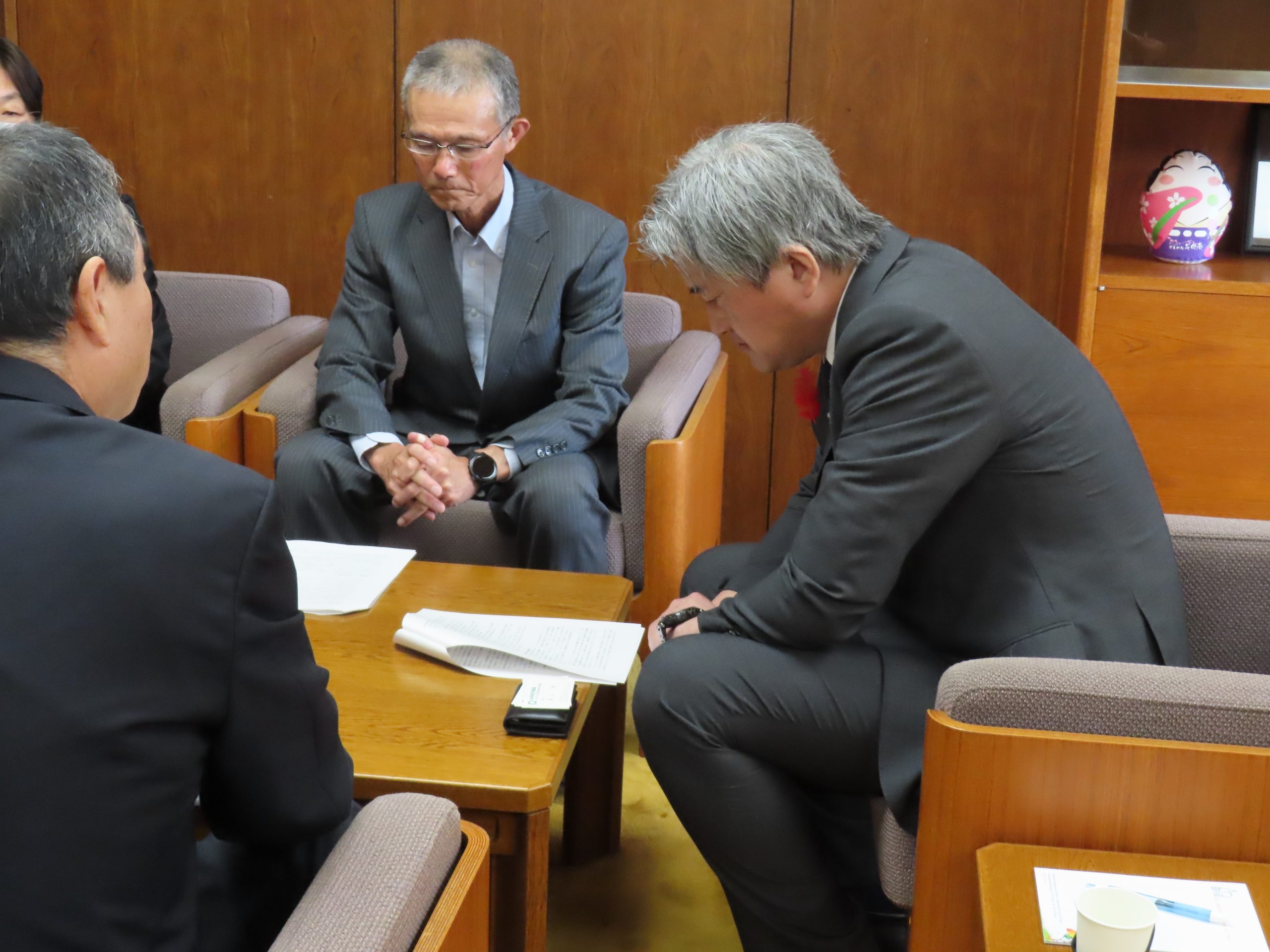 【舩山理事長(写真左)から折原副知事(右)に要望書を提出】
