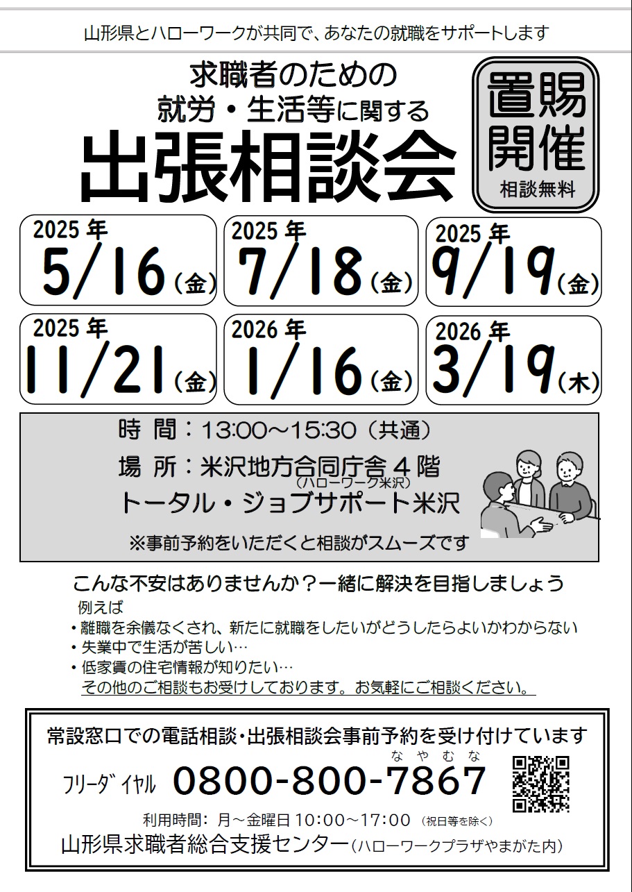 会場:トータル・ジョブサポート米沢(米沢市金池3-1-39ハローワーク米沢4F)