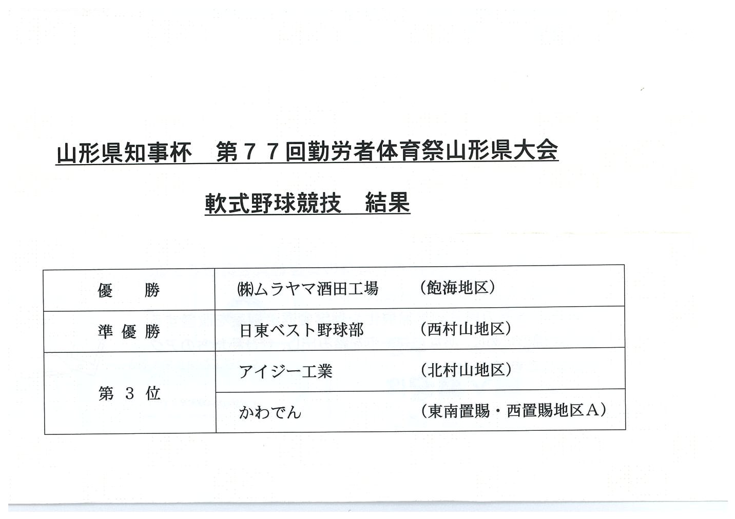 勤労者体育祭 2025.10.20 【速報】山形県知事杯 第77回勤労者体育祭 軟式野球県大会 結果 暑くもなく寒くもないさわやかな天候に恵まれた大会となりました。 ご協力をいただいた関係者のみなさま、大変ありがとうございました。 ・開催日 2025年10月18日(土)、19日(日) ・会 場 山形県総合運動公園 野球場